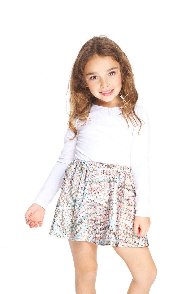 The world's her oyster! Our Nana's Pearls Skater Skirt is prim, polished, and printed with pearls. Inspired by bejeweled strands, this flared spandex skirt is perfect for playing dress up. Made in the USA