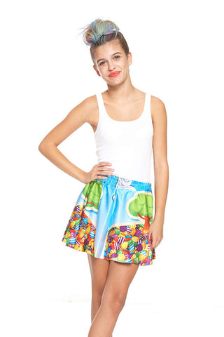 We take you to a world with whip cream clouds and fields of dreams with our Candy Crush Sweet Skater Skirt! Your wardrobe has been lacking something this fun and whimsical, so get on board. Made in the USA.